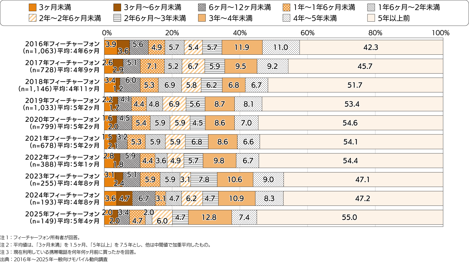 - 現在利用しているフィーチャーフォンの所有期間の平均は、2016年の「 4年6ヶ月」から2025年の「5年4ヶ月」に伸びている。