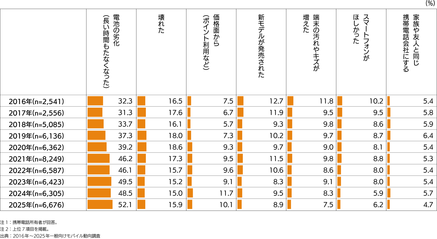 - 「電池の劣化」(52.1%)が突出しており、「壊れた」(15.9%)、「価格面から」(10.1%)が次点で続く。