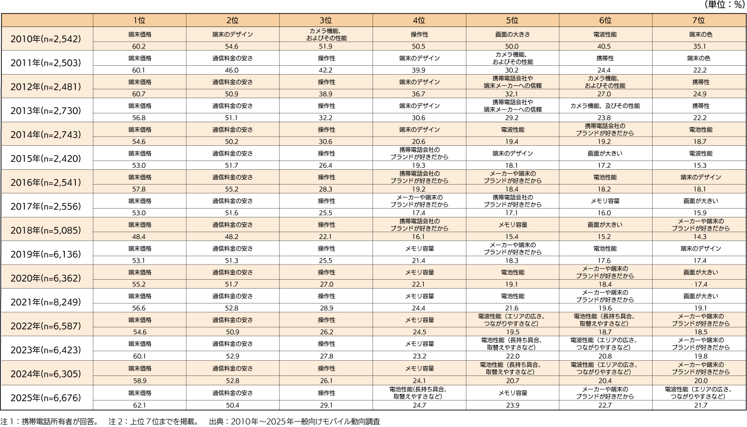 - 「 端末価格」「通信料金の安さ」が2011年以降上位を独占しており、価格重視の傾向が見られる。