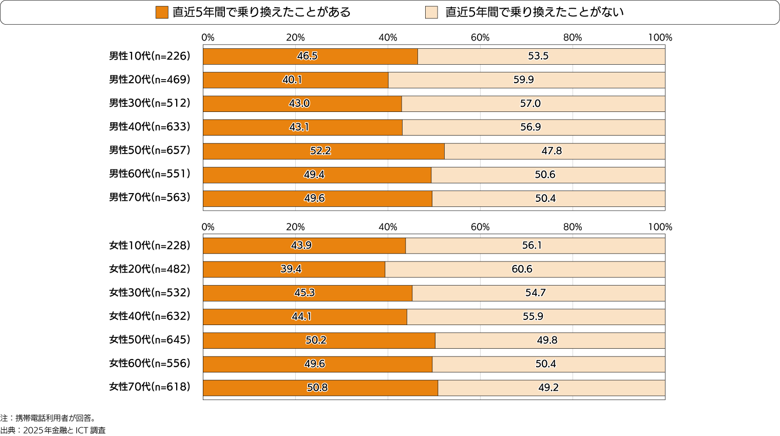 - 各年代で約4~5割が直近5年のうちに通信キャリアの乗換を経験。