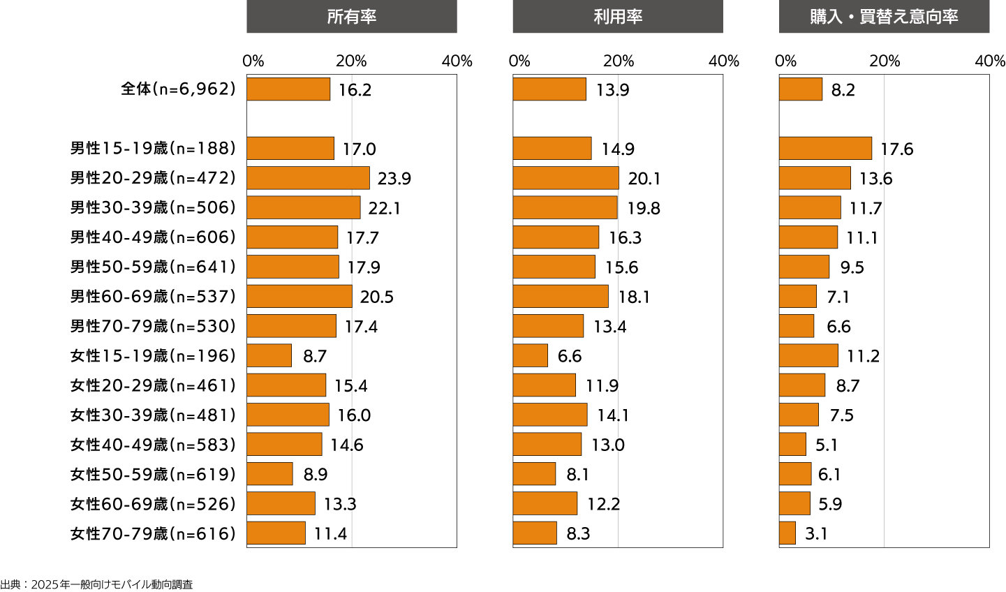 - 男女ともに20代の所有率が最も高く4人に1人が所有。