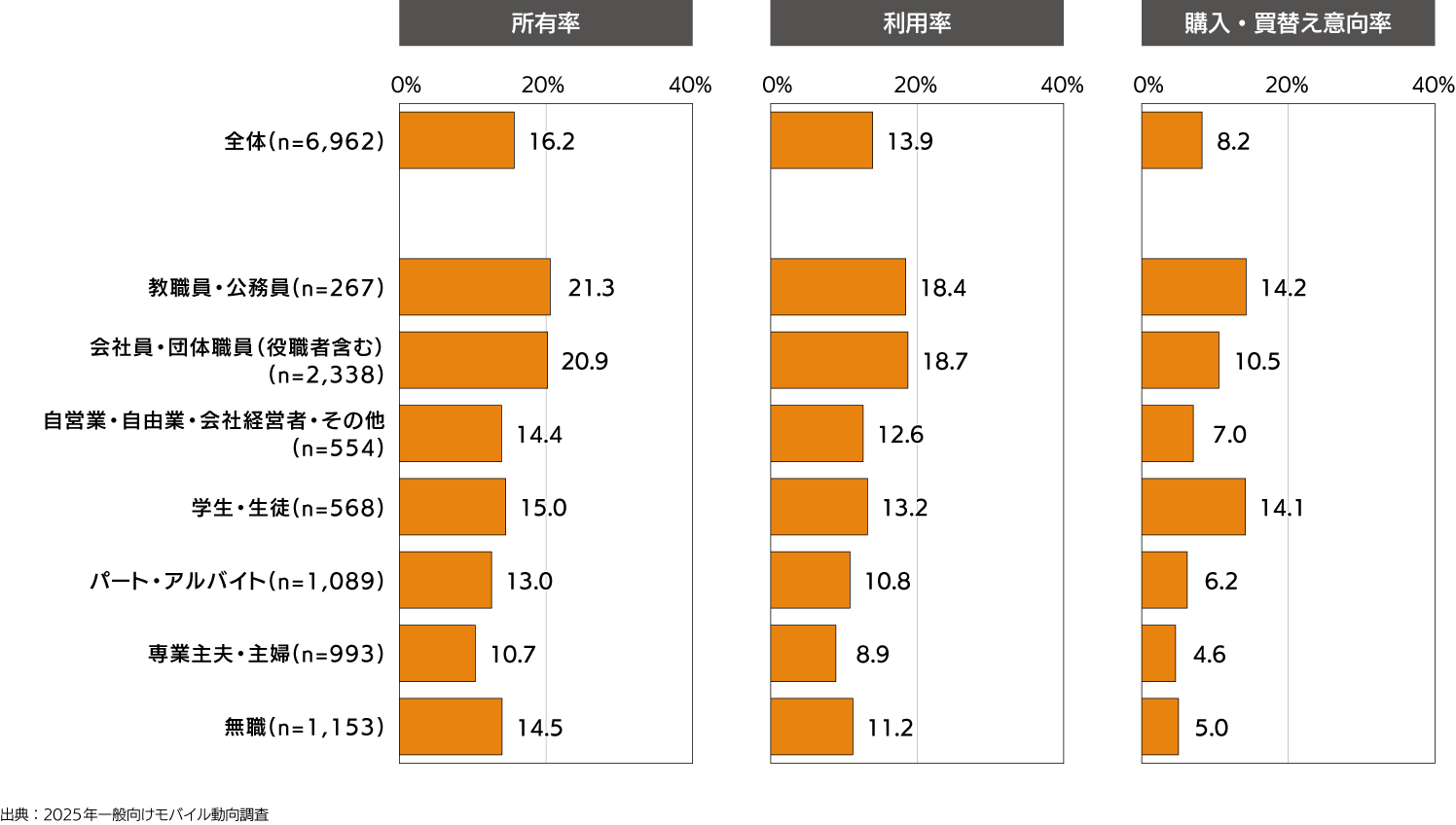 - 職業別に見ると所有率、利用率、購入・買替え意向率ともに教職員が最も高い。