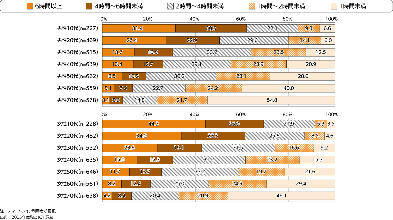 - 1日6時間以上利用する割合は女性若年層で高く、10代女性では4割超。
