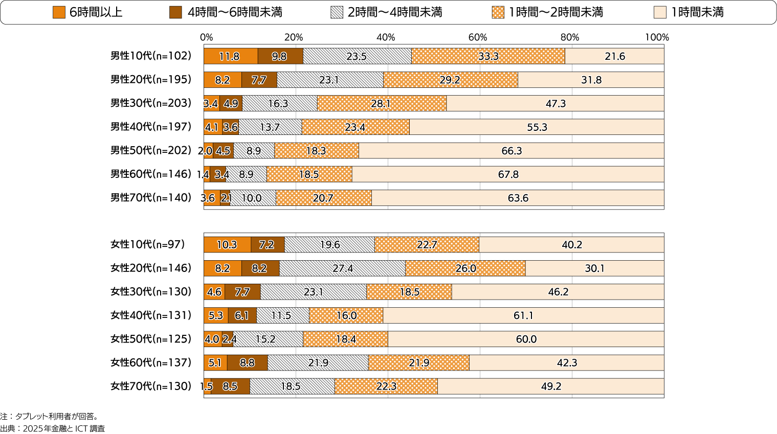 - タブレット利用時間が長い割合は男性若年層で高い。
